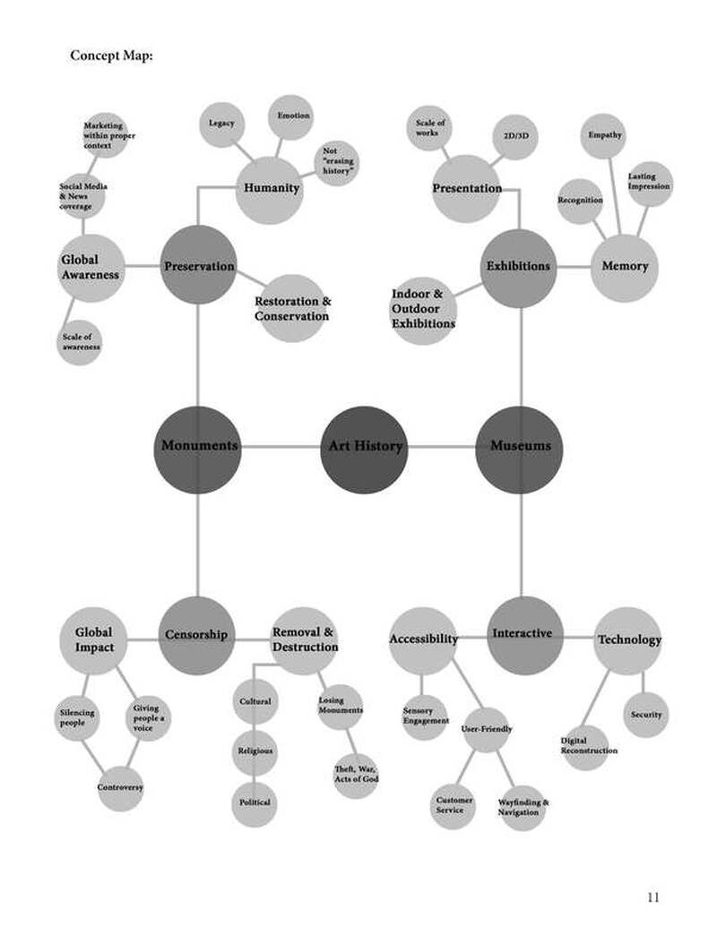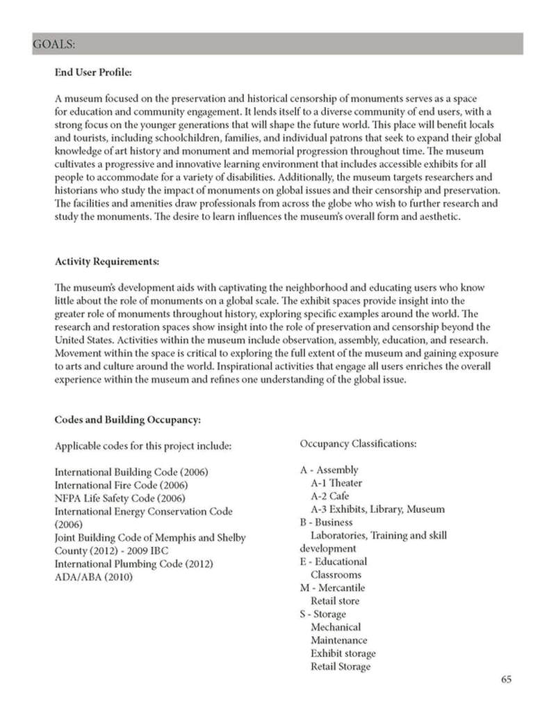 Monuments throughout history have been lost in various ways including theft, war, iconoclasm and vandalism, acts of God, temporal works, destruction of owner, and burial and exhumation. The museum will focus exhibits on the types of loss monuments have experienced while educating individuals about the past, informing about present events, and advocating for the future. The museum's program calls for a Restoration and Preservation Studio and a Research Library in order to preserve artifacts and address historical periods that serve as the foundation for many societal issues we face today. The final museum for lost monuments will bridge an educational gap, while focusing on a creating a global and personal impact for each visitor.