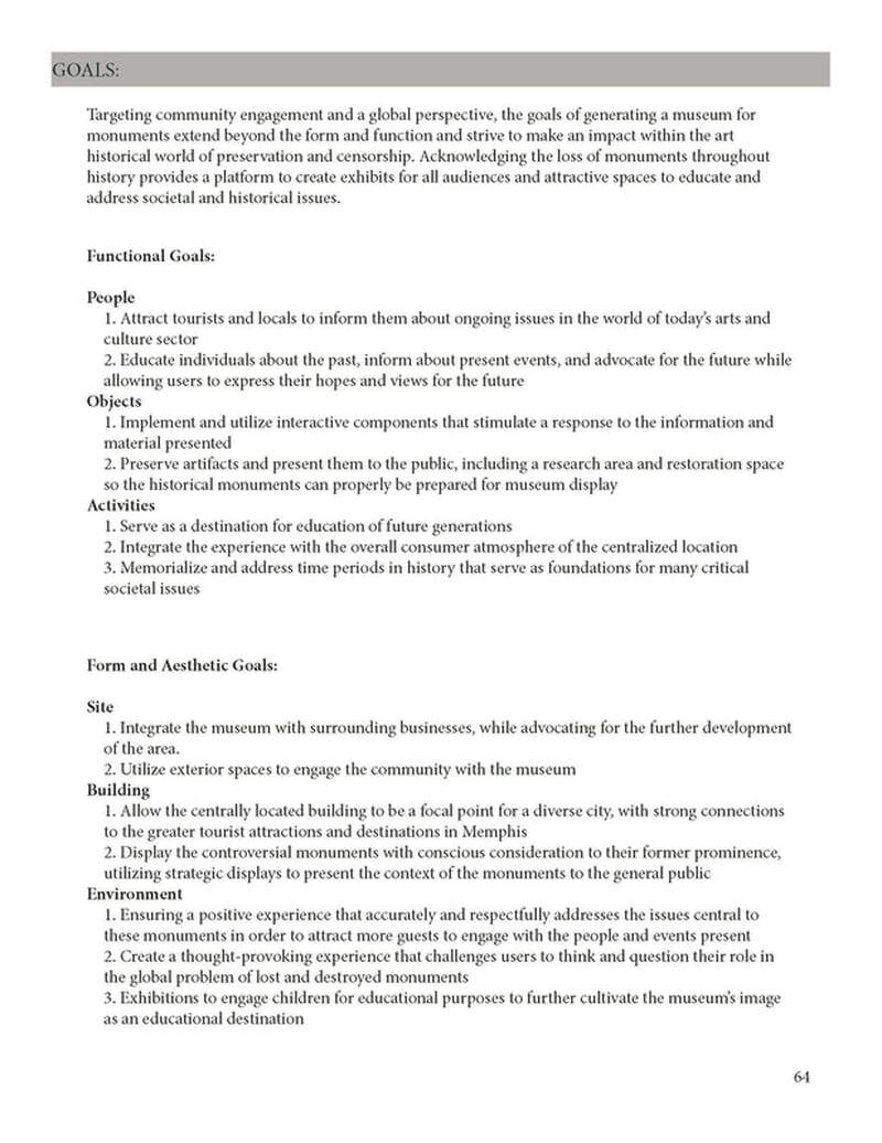 Ultimately, monuments face being erased from history through their removal, censorship, and lack of preservation as historical works of art. A museum poses an educational opportunity to curate an excitement for knowledge and discovery. This museum presents information respectfully, in an educational manner, while using other museums as precedent studies to understand the best way to display the monuments and contextualize them. The museum incorporates interior and exterior spaces to tie the monuments to their former space in the urban landscape.