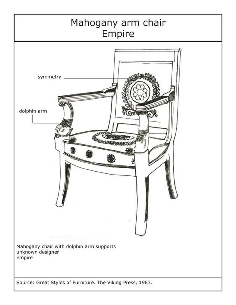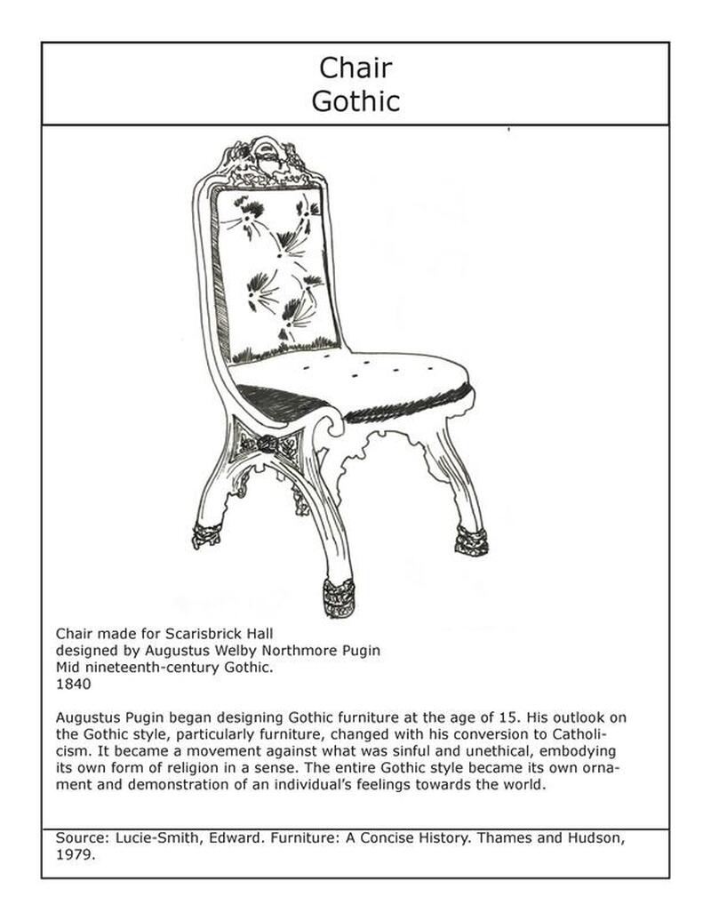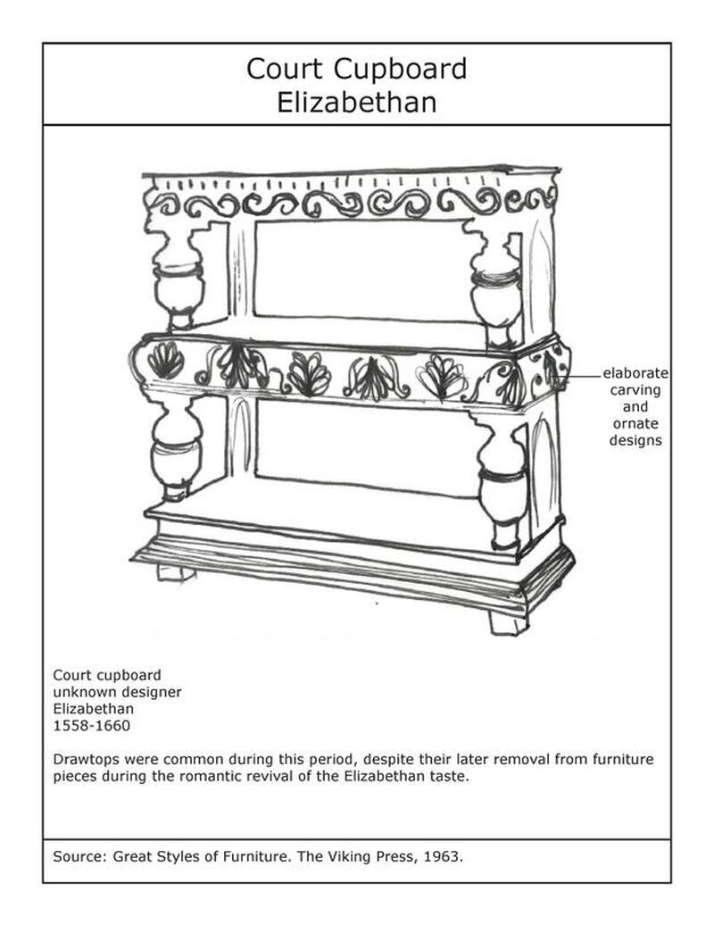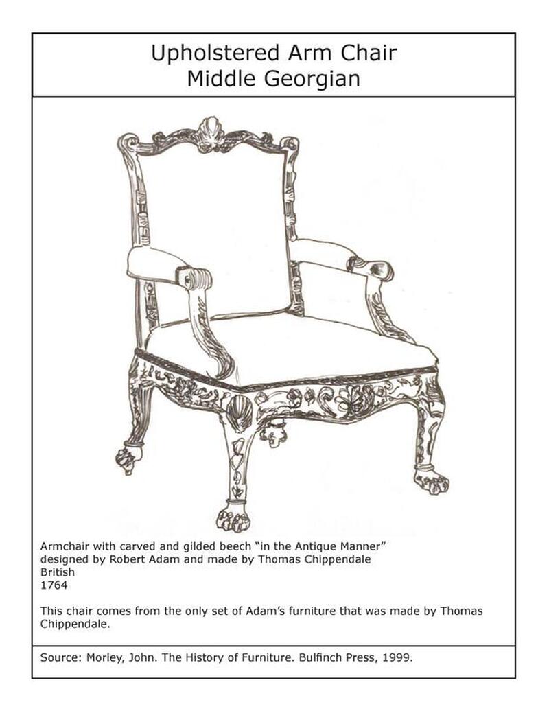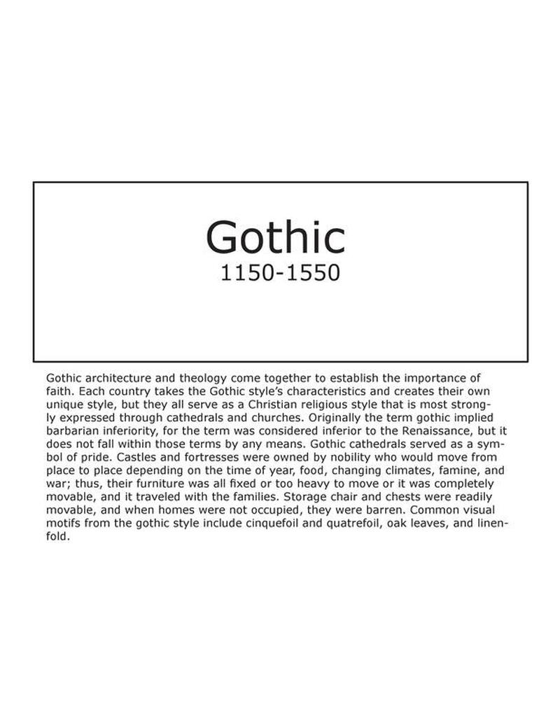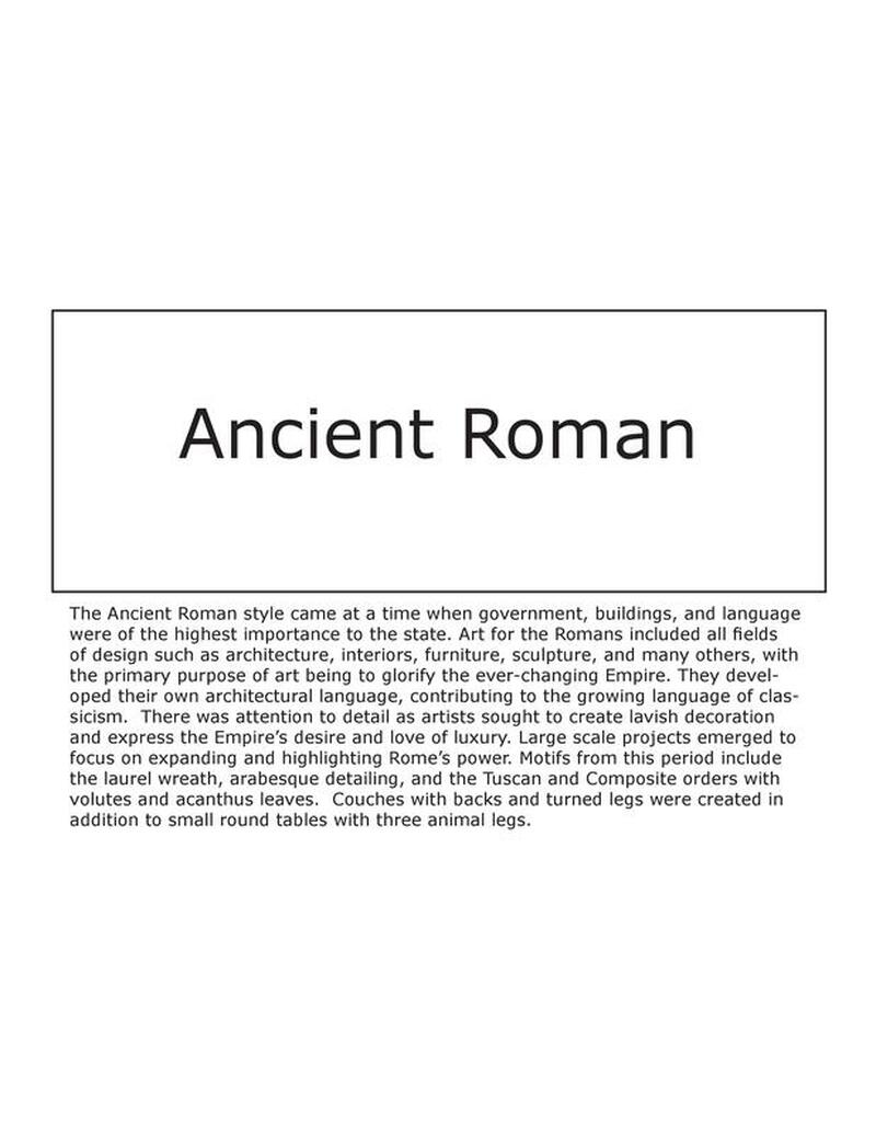 Highlights the various types of furniture seen through historical time design styles including Egyptian, Roman, Gothic, Elizabethan, Italian Renaissance, Baroque, Rococo, Neo-Classical, Empire, and Middle Georgian.
