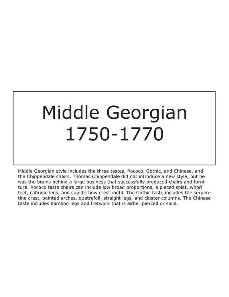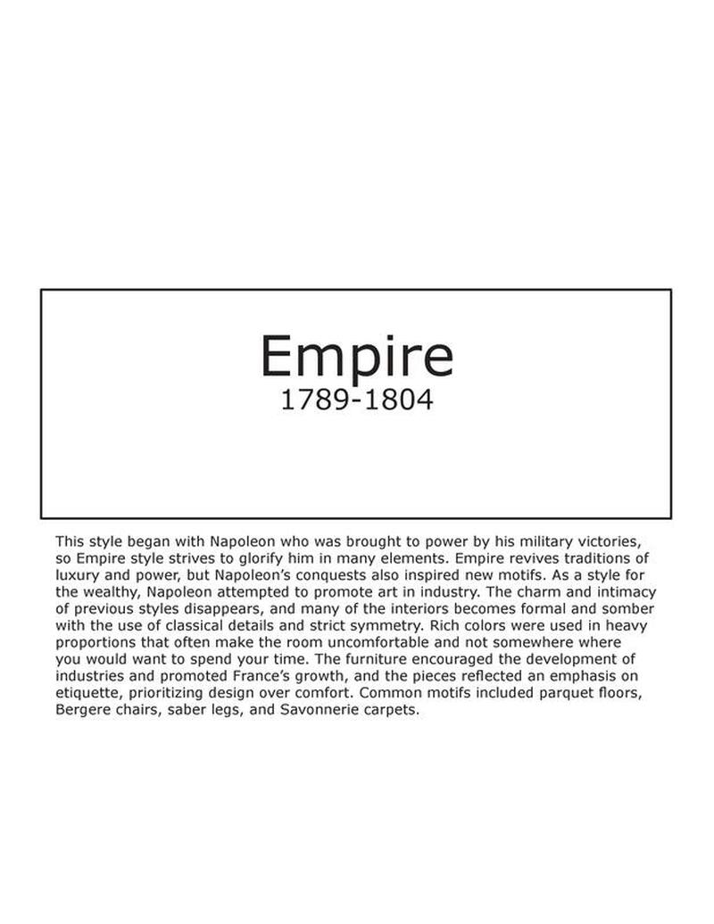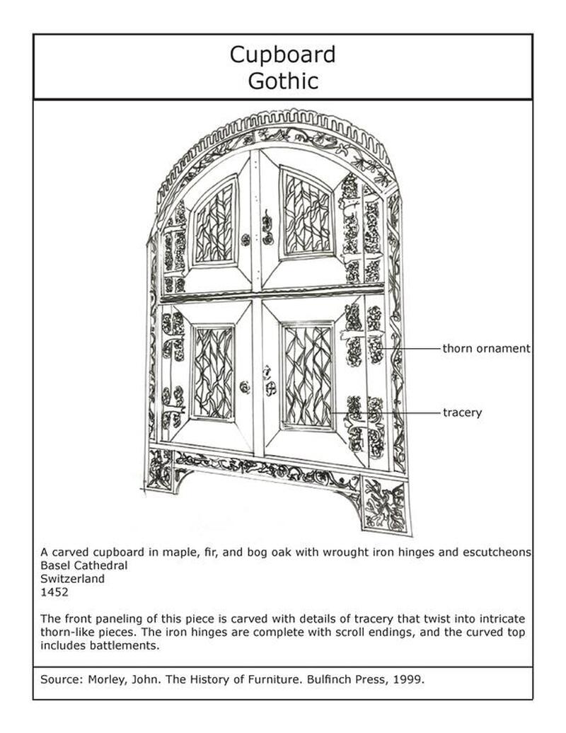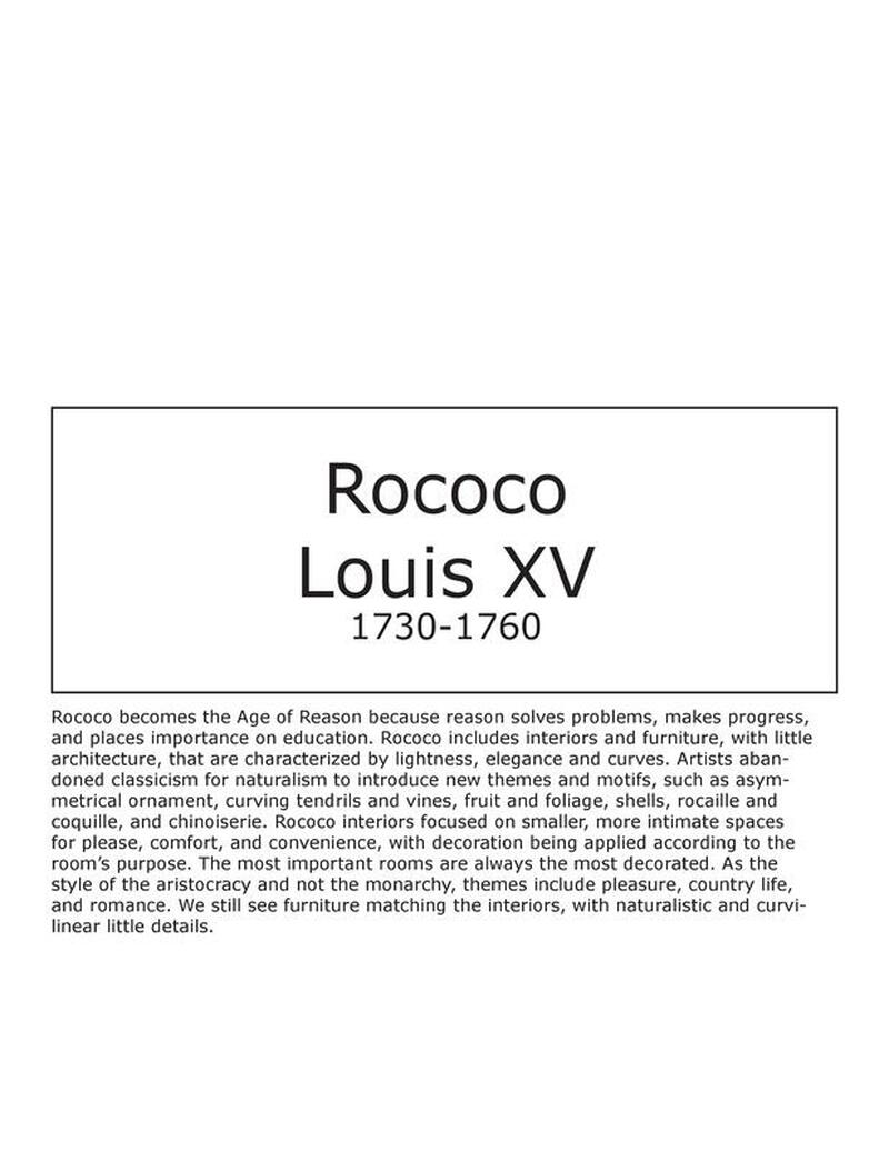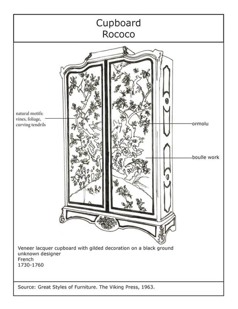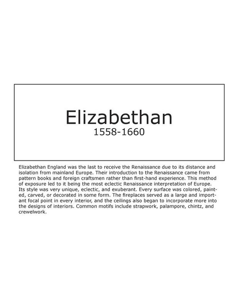 Highlights the various types of furniture seen through historical time design styles including Egyptian, Roman, Gothic, Elizabethan, Italian Renaissance, Baroque, Rococo, Neo-Classical, Empire, and Middle Georgian.